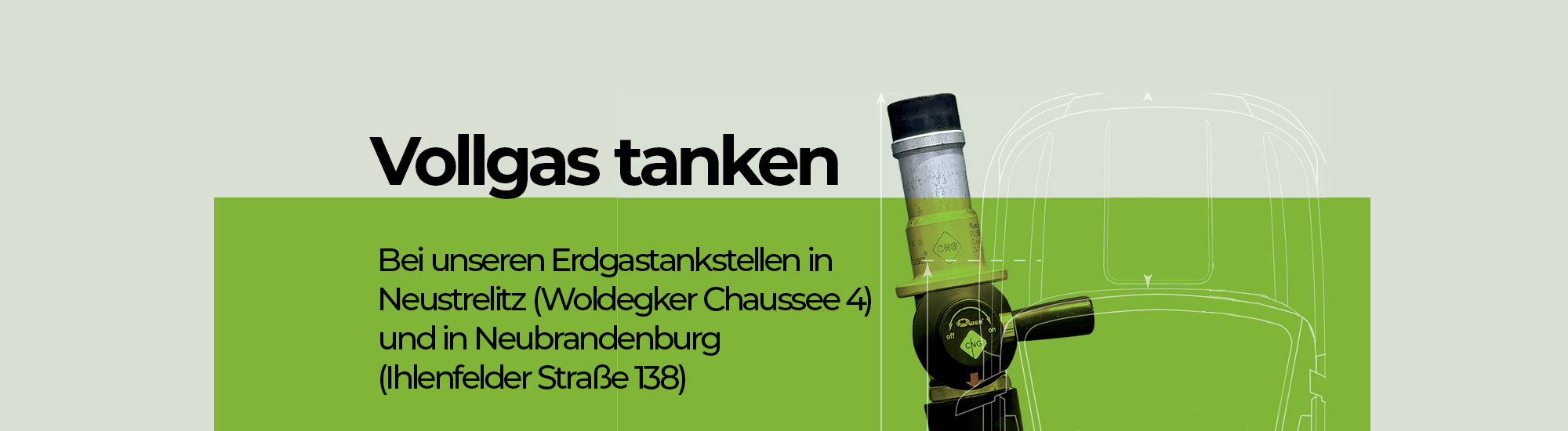 Die Stadtwerke Neustrelitz betreiben zwei Pkw-Erdgastankstellen. Im Herbst 2002 wurde die erste Station in der Woldegker Chaussee 4 in Neustrelitz in Betrieb genommen. Fast auf den Tag 13 Jahre später folgte 2015 unsere zweite Erdgastankstelle in Neubrandenburg in der Ihlenfelder Straße 138.